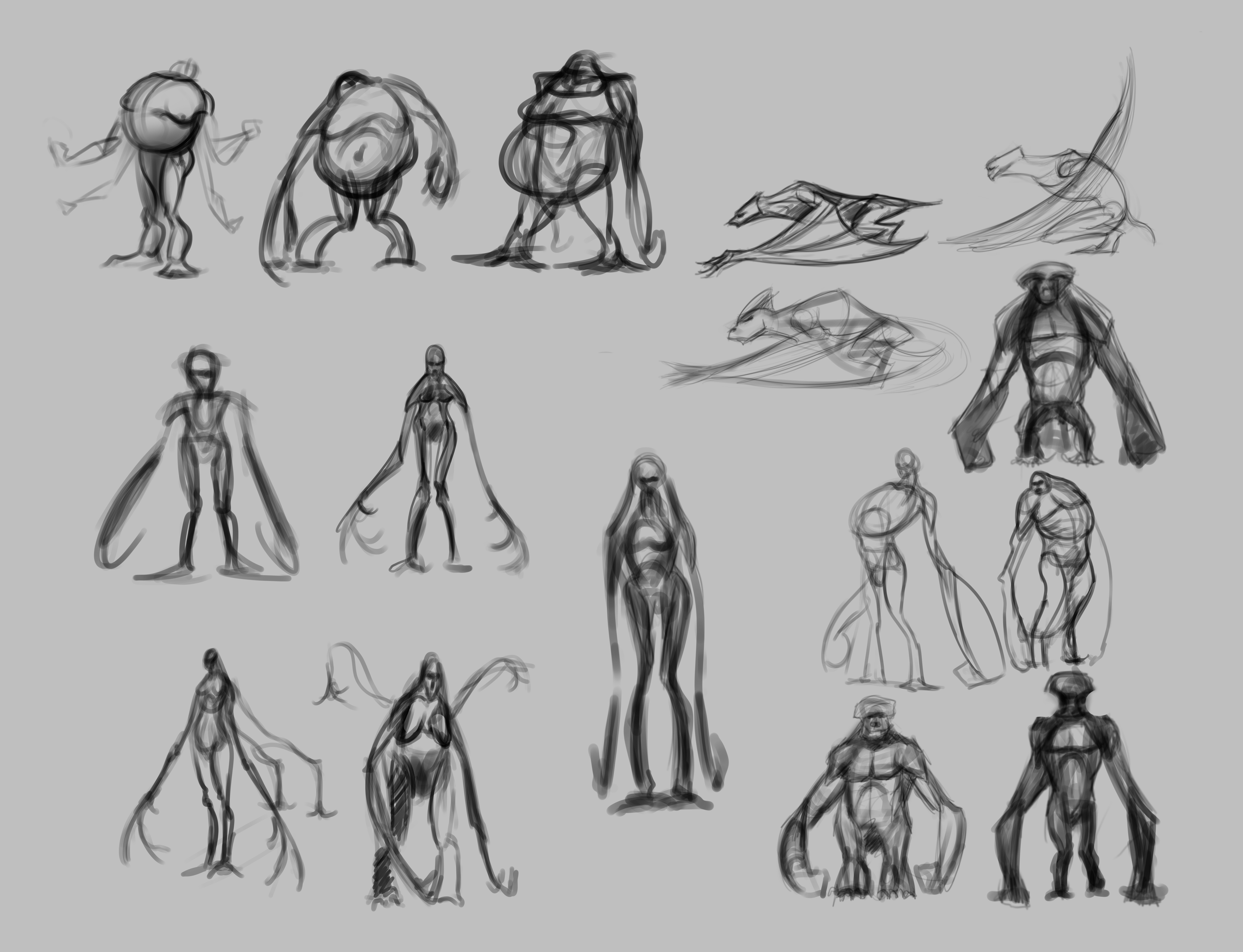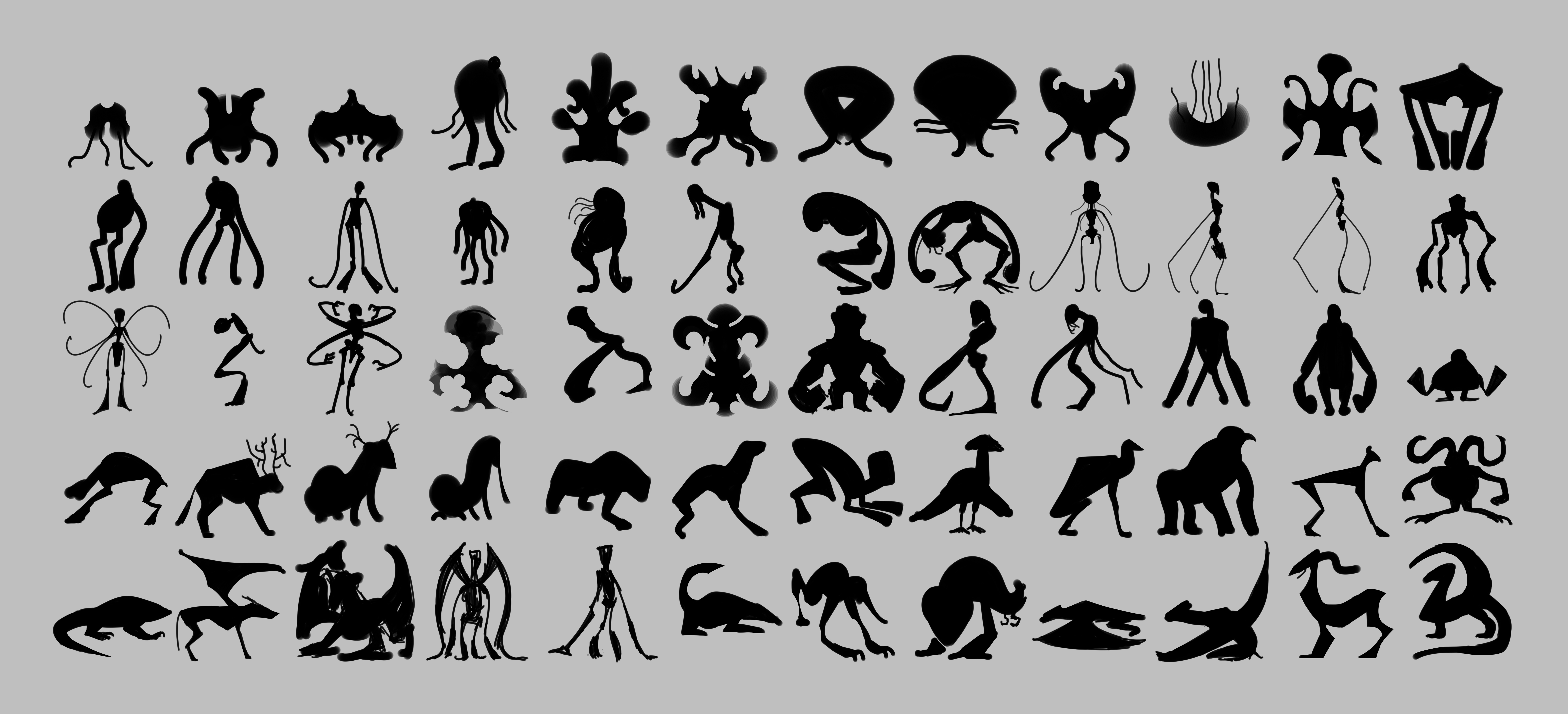 Throughout my time studying Creature Design with Bobby, we began with thumbnails which were further developed to full model sheets. This project was inspired by some of my earlier silhouettes and sketches. I took existing base meshes and distorted the silhouettes inside zBrush, with the intention on focusing on shape, proportion and rhythms.