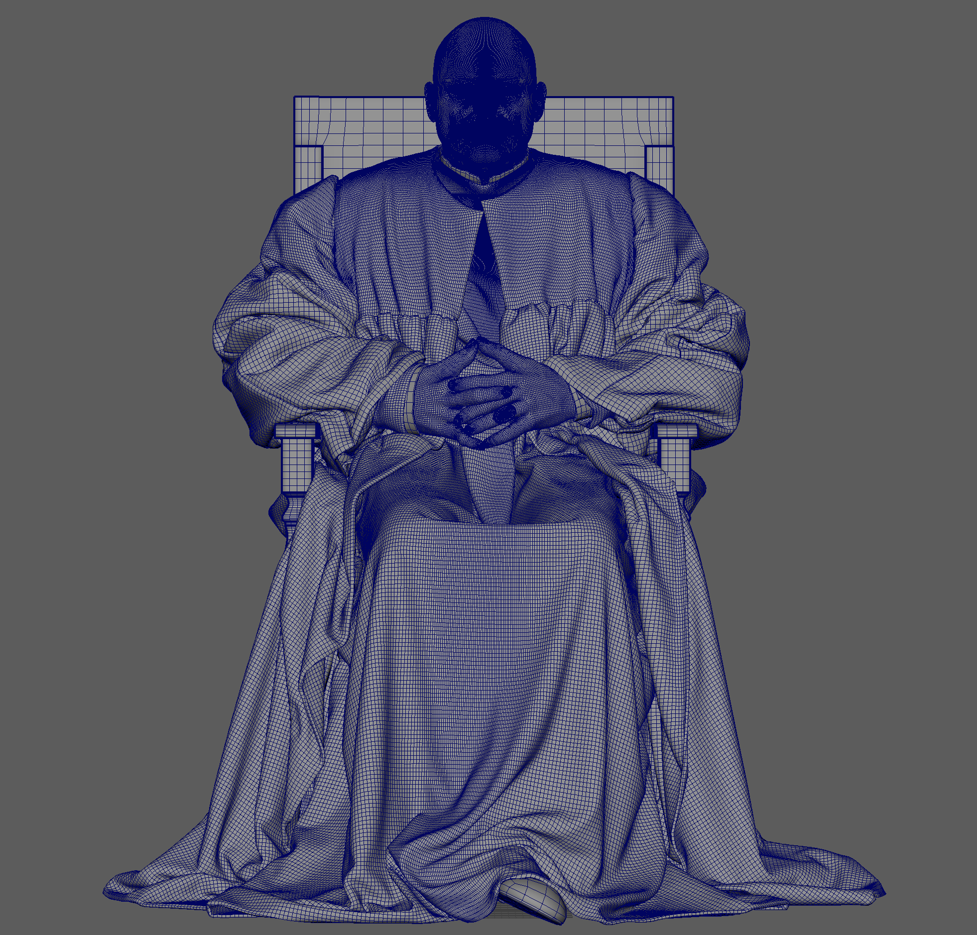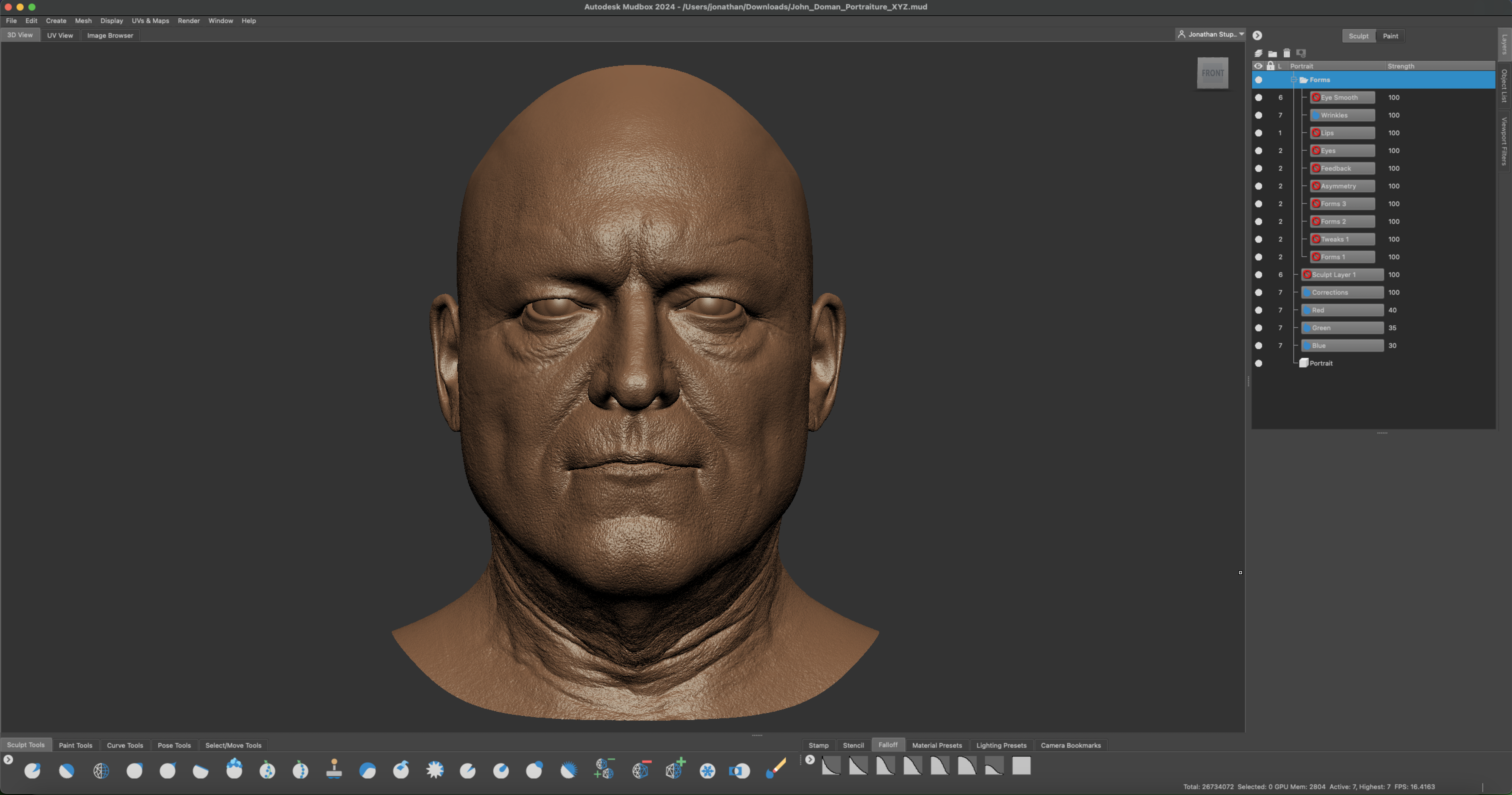 Initially I started sculpting the portrait inside zBrush, but quickly moved to Mudbox for several reasons: managing UDIM’s, cameras, materials, brushes, layers, etc. Texturing XYZ VFACE textures were used and transferred to my base mesh.